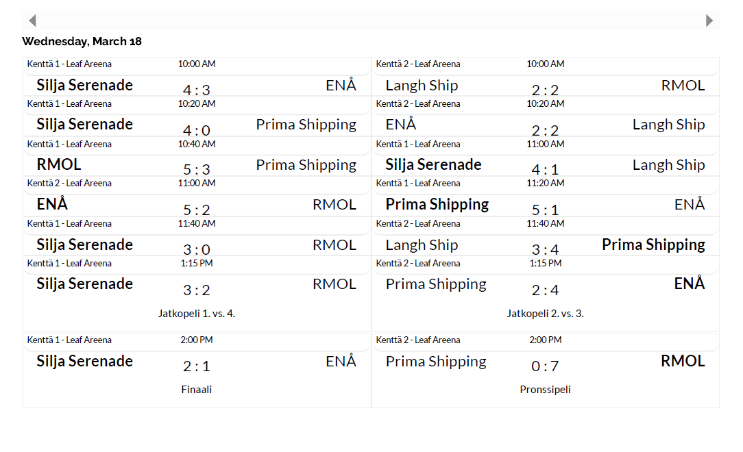 Jatkopeleissä, pronssipelissä ja finaalissa 2 x 10 min juoksevaa aikaa. 5 min tauko välissä.